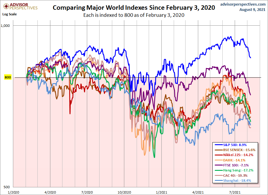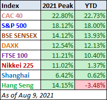 Seven out of eight indexes on our world watch list posted gains through August 9, 2021. The top performer is France's CAC 40 with a gain of 22.73%, our own S&P 500 is in second is with a gain of 18.00%%, and India's BSE SENSEX is in third with a gain of 13.93%. Coming in last is Hong Kong's Hang Seng with a loss of 3.48%.