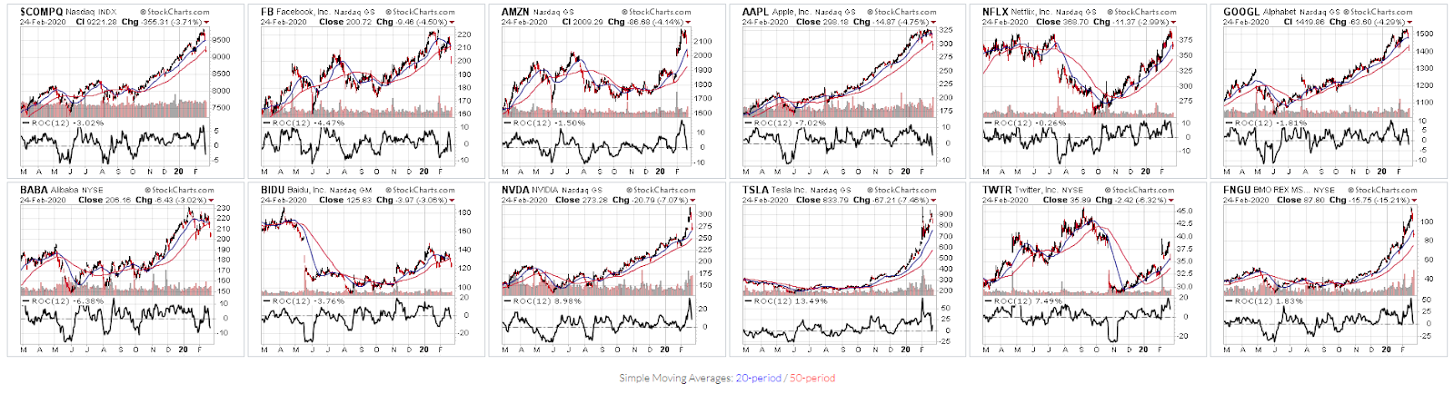 - You can see from the last two chartgrids where Monday's closing price on each of the ten stocks, as well as FNGU and the Nasdaq Composite Index, sits in relation to their respective 50-day moving average (red). They are either above, below or near it, which is acting as support or resistance. Three of them (FB, BABA and BIDU) are the weakest, after failing to make new swing highs, and their 20-day MA is in the process of crossing below their 50-day MA...hinting at further weakness ahead for these three stocks. The ROC on 8 out of the 12 are below the zero level...hinting at further weakness ahead for the Tech sector. Keep an eye on the ROC on NVDA, TSLA, TWTR and FNGU on the daily timeframe...if they also drop and hold below zero, and if the others hold below, watch for further sharp selling in the Tech sector.