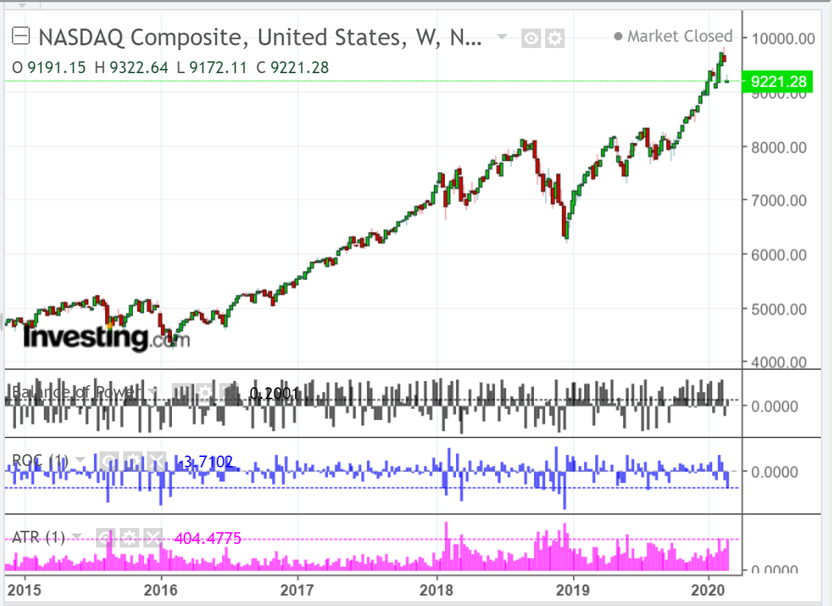 - The Nasdaq Composite Index did attempt to reach 10,000, but stopped short at its new all-time high of 9838.37 last week, as shown on the weekly chart below.