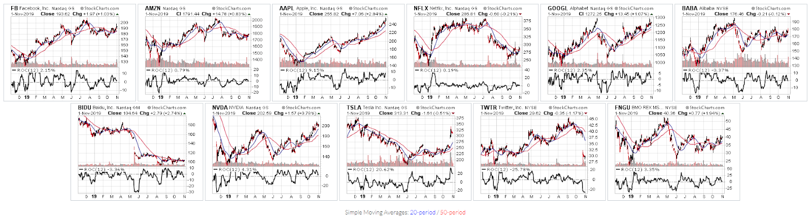 Keep an eye on AMZN, NFLX, BABA, BIDU, and TWTR to see if they can claw their way back to an uptrend...especially TWTR, which can't afford to turn down advertising dollars from political ads pertaining to the 2020 election, as was recently decided by its CEO.