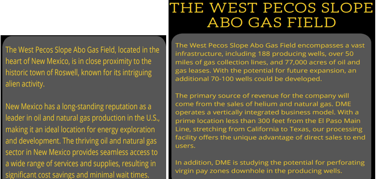 The Company currently has modest He & natural gas production from its West Pecos Slope Abo gas field in the southwestern state of New Mexico (“NM”). Before NM, the Company successfully explored for He, hydrogen, and noble gas on properties in northeastern Arizona (“AZ”).