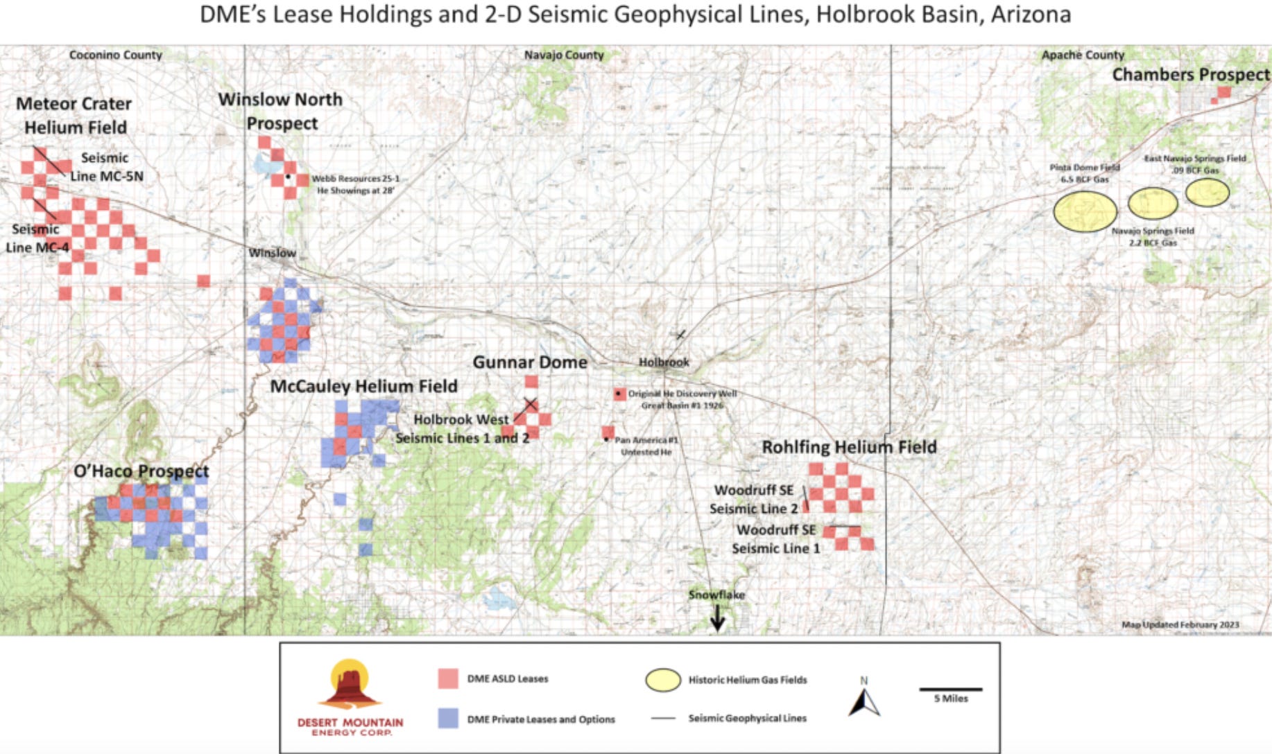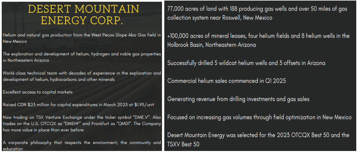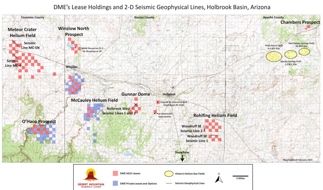 In AZ it holds mineral leases on state & private lands, totaling > 100,000 acres, and successfully drilled five wildcat wells + three offsets —> identifying multiple He fields. Readers are reminded that Desert’s market cap reached ~C$330M in 1H/2022 on the AZ assets alone.