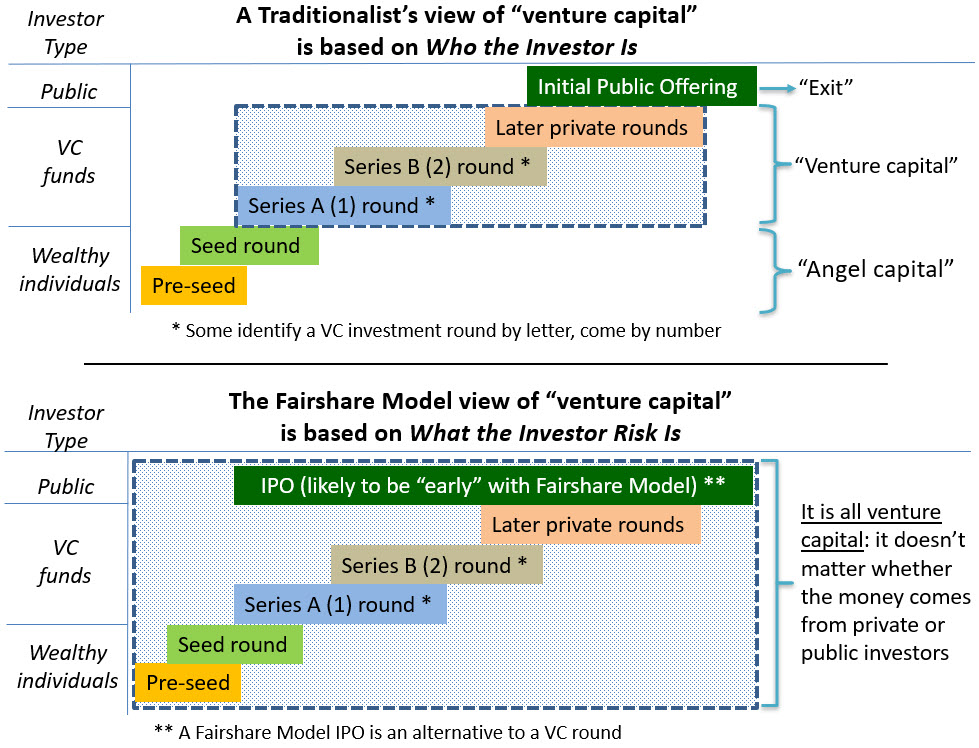 A foundational concept for the Fairshare Model is that capital provided to a venture-stage company is venture capital regardless of its source. Ergo, it doesn't matter whether the money is raised in a private or public offering.