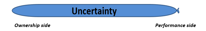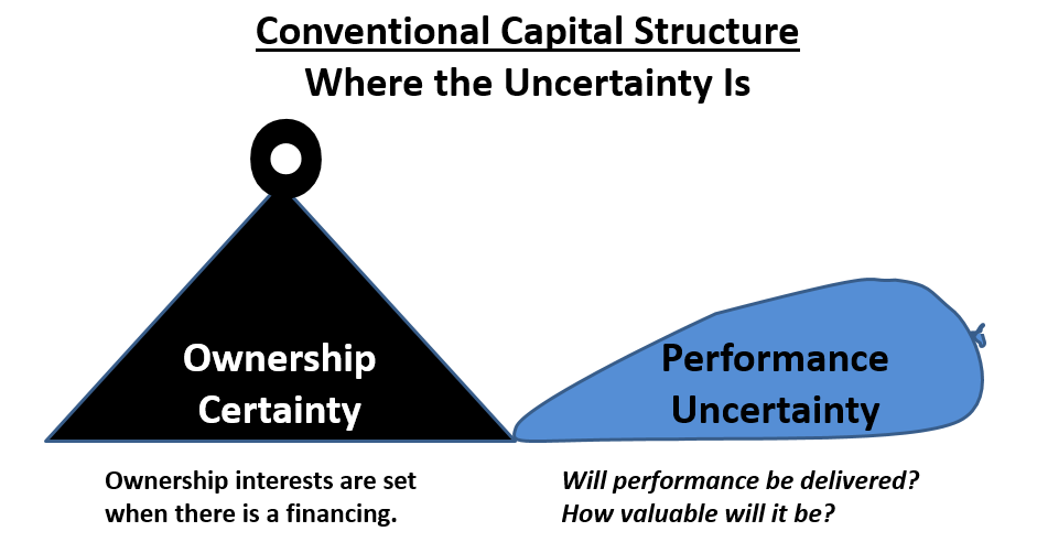 The following balloon illustrates what happens in a conventional capital structure. When equity is raised, the ownership it buys is set by the pre-money valuation. It is symbolized by weight of certainty on the ownership end of the balloon, which pushes the uncertainty to the performance end.
