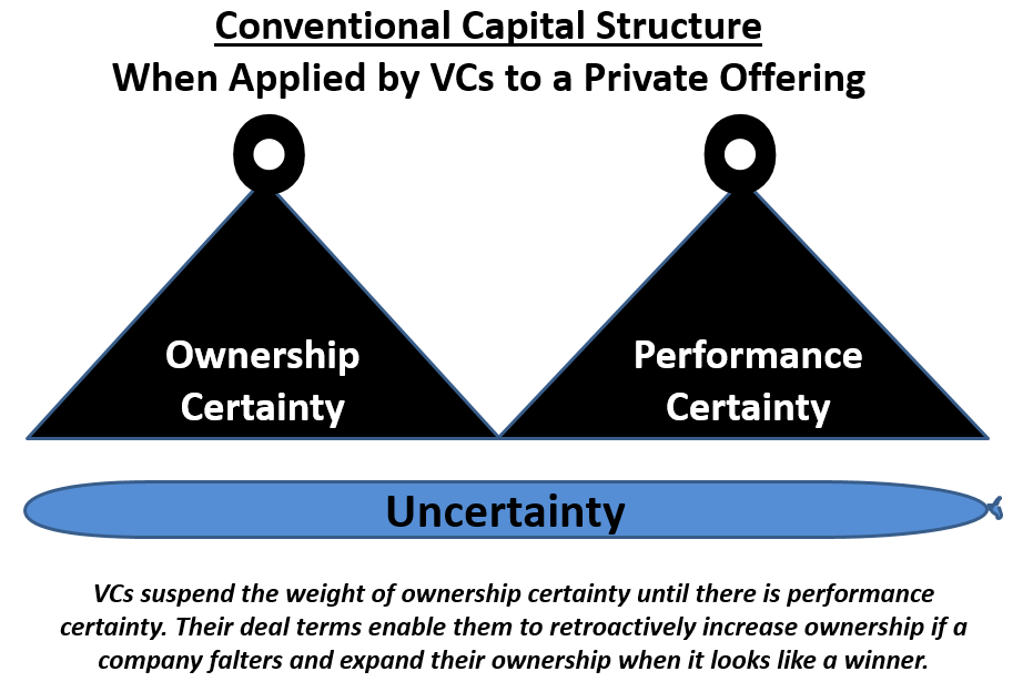 The final balloon illustrates a modified conventional capital structure. It's used by VCs when they invest in a private offering. Its deal terms suspend certainty about ownership until there is certainty about performance.