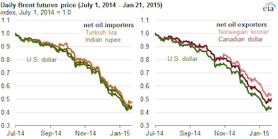 As we know the Brent crude oil futures are priced in U.S. Dollars (USD). The increase in value of the USD against other currencies and the recent decline in USD crude oil prices has logically different effects on oil importers and exporters as the EIA (U.S. Energy Information Administration) points out:
