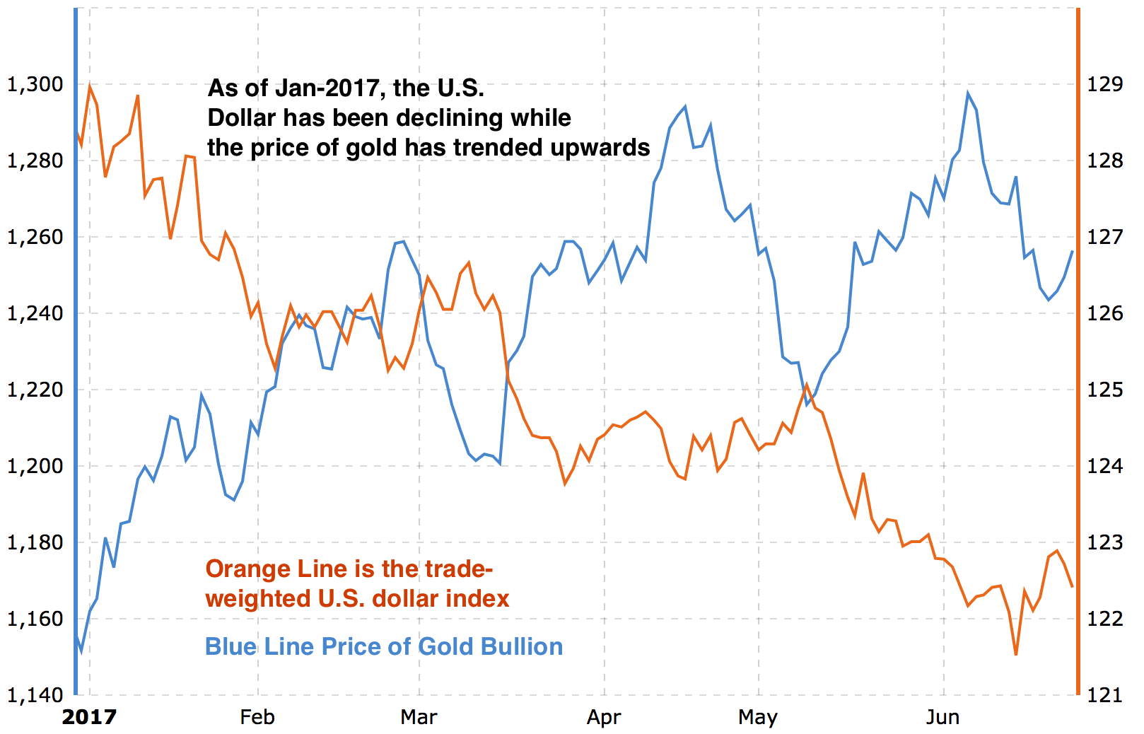 But gold has held relatively steady in the face of multiple rate hikes and a strong dollar. And since 2017, the price of gold has strengthened, while the U.S. dollar has trended lower.