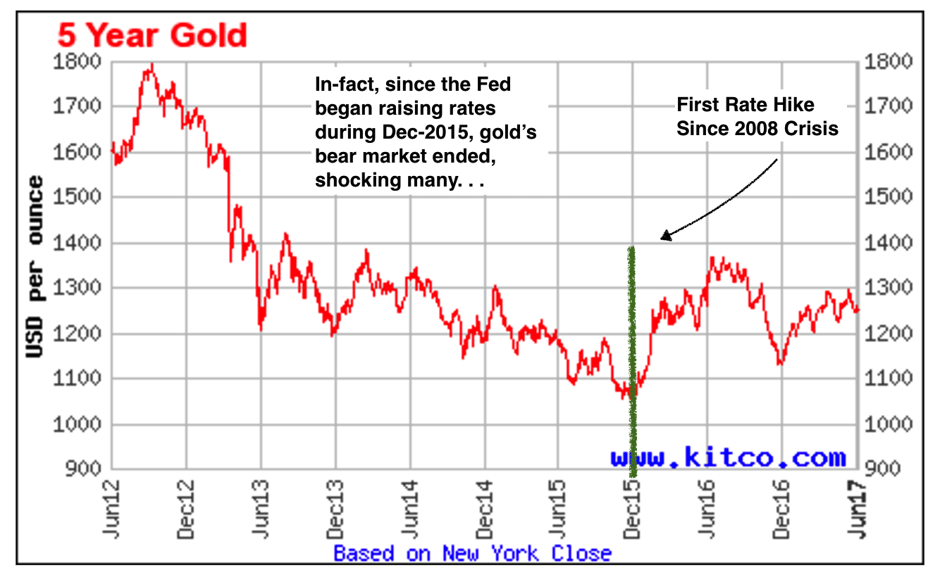 Actually, it is the exact opposite. The first rate hike that happened December 2015 sparked the life back into gold after 3.5 years of a brutal bear market.