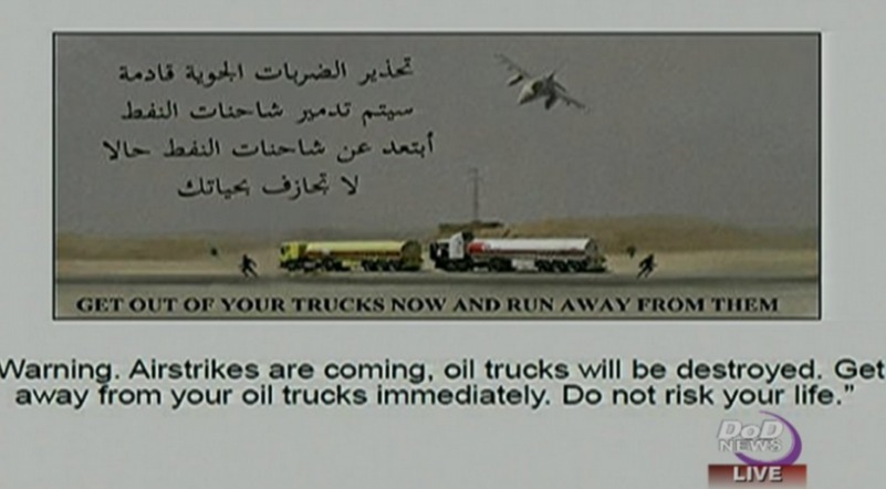 The argument was made by Col. Steve Warren that "This is our first strike against tanker trucks, and to minimize risks to civilians, we conducted a leaflet drop prior to the strike. We did a show of force, by--we had aircraft essentially buzz the trucks at low altitude."