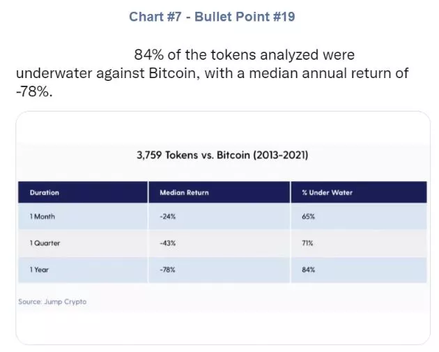 - It's not just me cherry-picking here. Jump Crypto performed a study that analyzed the performance of 3,759 tokens against BTC over the 8 years between 2013-20021. It concluded that 84% of the tokens analyzed were underwater against Bitcoin, with a median annual return of -78%. [Mish Comment: Chart 7 Below]